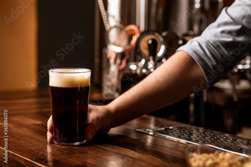 Fresh dark beer with foam in pub. Bartender gives glass to dark drink with foam on bar counter
