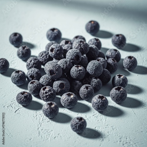 Fresh, dark blueberries piled on a light blue textured surface