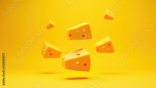 Fresh delicious cheese floating in the air against a yellow background. Food levitation idea, high-quality image.