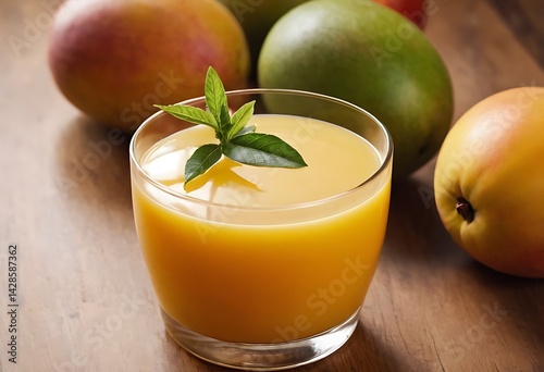 Fresh delicious mango juice smoothie in a glass on table background