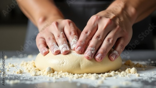 Fresh dough and flour on a board. dough for pizza or bread. kneading dough in kitchen