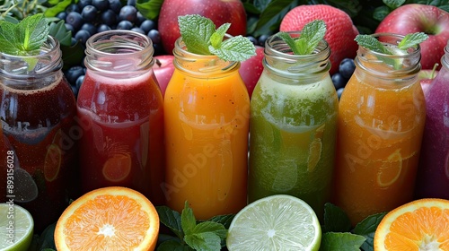Fresh fruit and vegetable juices in bottles with fresh fruits and berries