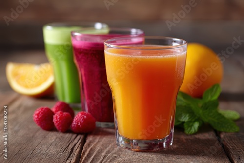 Fresh fruit juice and smoothie glasses arranged on a rustic wooden table