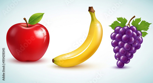 Fresh fruit selection with apple, banana, and grapes on white background