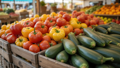 Fresh Garden Bounty: Colorful Bell Peppers, Tomatoes, and Zucchini at Market