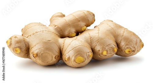 Fresh ginger root with its characteristic nodules and pale brown skin on white background