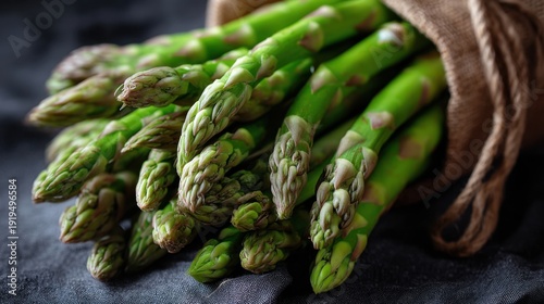 Fresh green asparagus bunch on dark fabric surface.