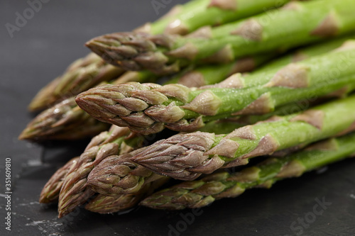 Fresh green asparagus on stone background, close up view