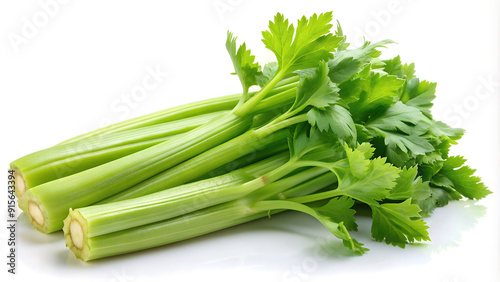 Fresh green celery stalks with vibrant leaves on a white background, showcasing their crisp texture and healthy appeal.