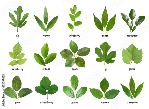 Fresh green leaves of fruit plants on white background. Collage with names