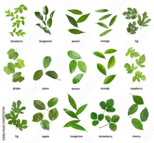 Fresh green leaves of fruit plants on white background. Collage with names