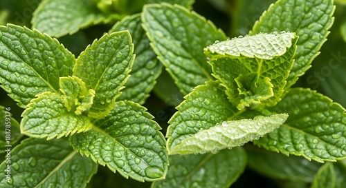 Fresh green mint leaves glisten with water droplets after a rainfall.