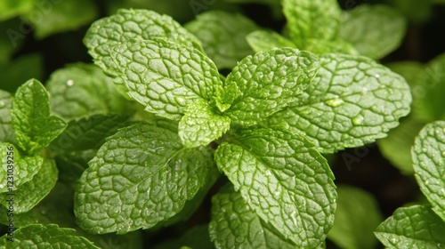 Fresh Green Mint Leaves with Textured Surface and Dew Drops