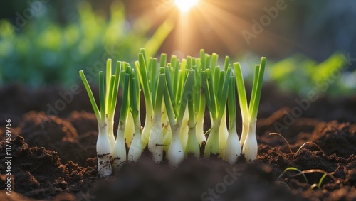 Fresh green onion sprouts growing in rich soil under warm sunlight in a garden.