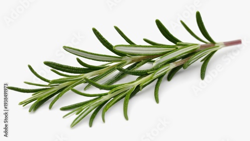Fresh green rosemary sprig isolated on a white background, showcasing its needle-like leaves and woody stem.