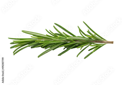 Fresh green rosemary sprig with needle-like leaves, isolated on a clean white background, perfect for culinary and herbal design elements.