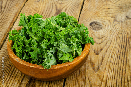 Fresh green sabellica leaves on wooden background, healthy organic food.