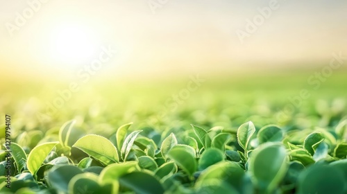 Fresh Green Tea Leaves in Sunlit Field at Dawn in Natural Setting
