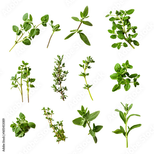 Fresh Green Thyme Sprigs on White Background for Culinary Art, Herbs, Cooking Ingredient Stock Photo