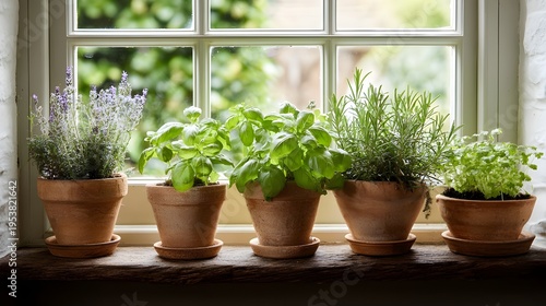 Fresh herb garden in terracotta pots on bathroom windowsill adding greenery to home decor