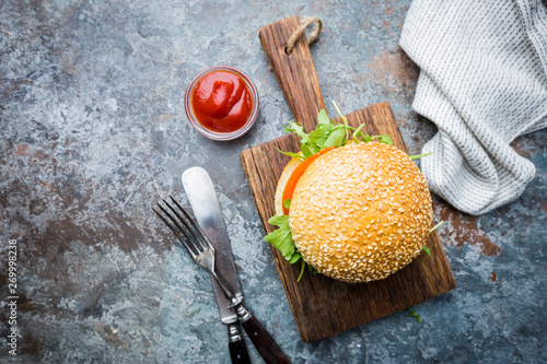 Fresh homemade burger on serving board with spicy sauce and herbs over dark stone background. Top view with copy space