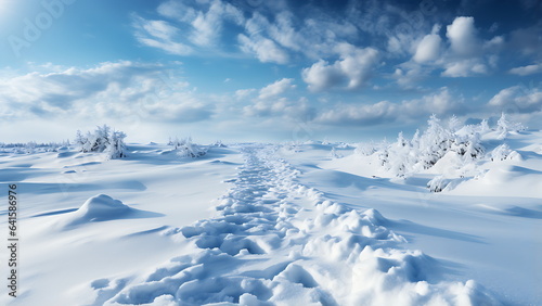 Fresh human boots footprints, chilly winter day.