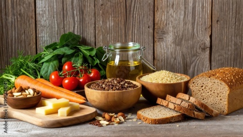 Fresh ingredients display with bread, vegetables, grains, cheese, and olive oil on rustic table.