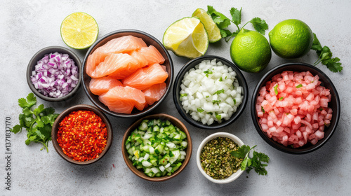 Fresh ingredients for vibrant dish, including salmon, herbs, and various chopped vegetables