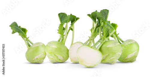 Fresh kohlrabi with green leaves on isolated white backround