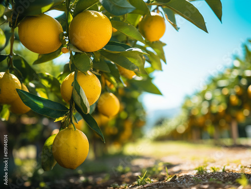 Fresh lemons on the tree in a lemon farm. It is ready to be picked by farmers and marketed. The weather is sunny and fresh.