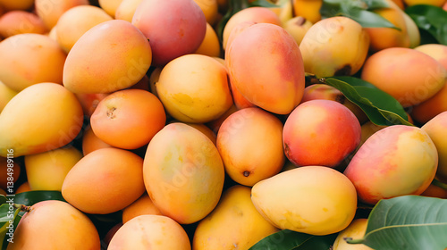 Fresh mangoes are piled together, showcasing their vibrant yellow and orange hues, with some green leaves adding touch of freshness. scene evokes sense of abundance and tropical delight