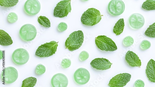 Fresh mint candies and leaves isolated on a white background, offering a cool and refreshing sensation.