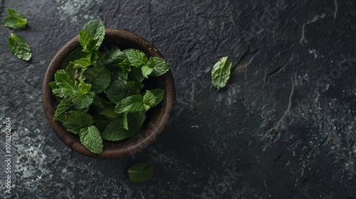 Fresh mint leaves cascade gracefully from a ceramic bowl onto a textured dark surface, creating a serene and refreshing visual symphony.