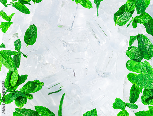 Fresh mint leaves on ice cubes background.
