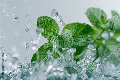Fresh mint leaves with water splash on nature background. Mint leaves with water drops
