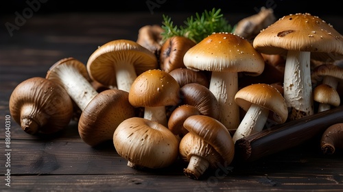 Fresh mixed forest mushrooms on the wooden black table. generative.ai