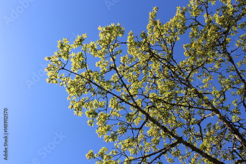Fresh new leaves grow on branches of the tree with a blue sky