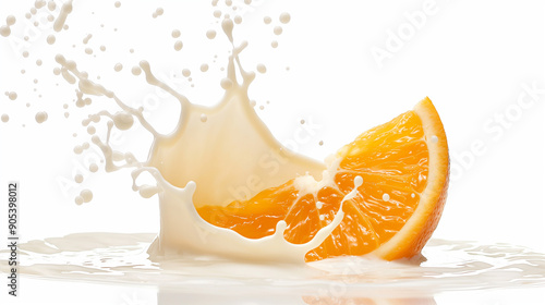 Fresh orange, slice , cut in half, dropped into milk or yogurt, isolate on a white background.