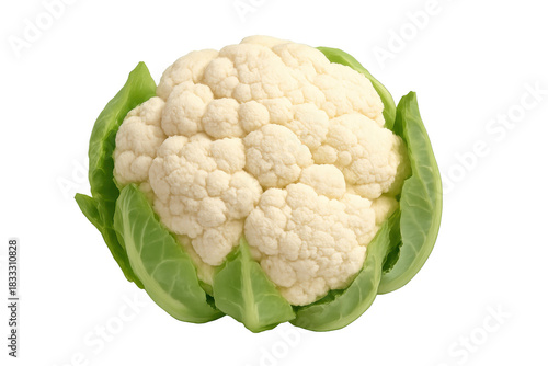 Fresh organic cauliflower showing healthy florets and green leaves on a transparent background