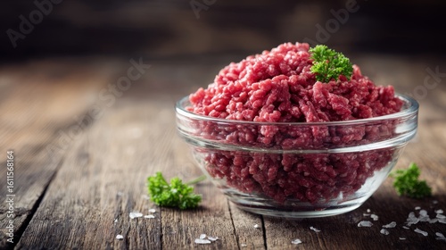 Fresh organic ground beef in glass bowl. Cozy rustic wooden background