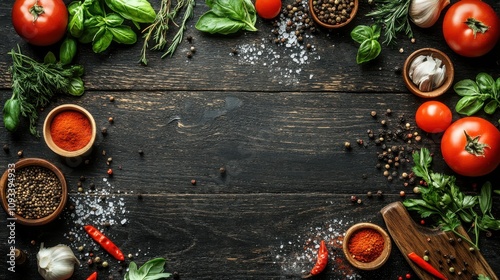 Fresh Organic Ingredients Surrounded by Chili Peppers and Spices on Dark Wooden Table Ideal for Culinary and Food Photography Projects