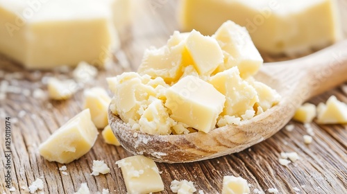 Fresh organic white chocolate chunks on a wooden spoon against a rustic backdrop : Generative AI