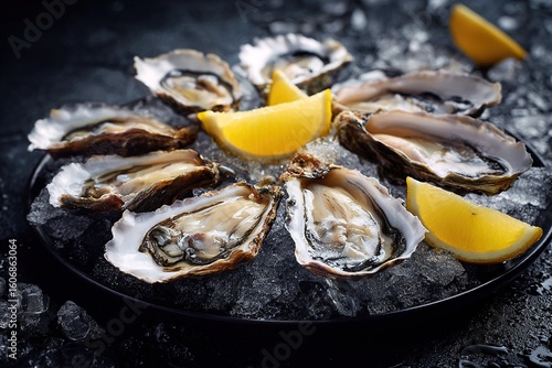 Fresh oysters on ice with lemon slices