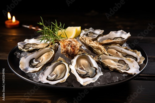 Fresh oysters with lemon on wooden table