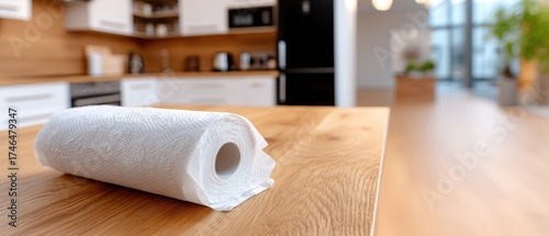 Fresh paper towel roll on a wooden kitchen counter with modern appliances and bright lighting in a spacious, stylish home setting