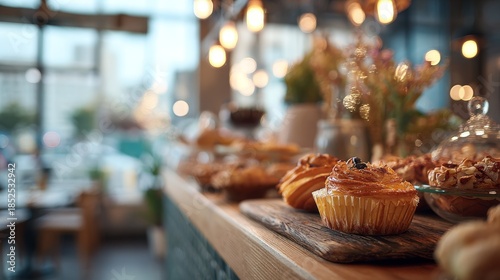 Fresh pastries on display case with cafe interior blurred background