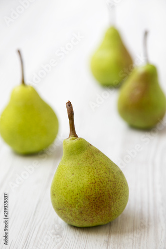Fresh pears on a white wooden table, side view. Closeup.