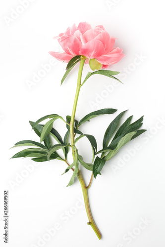 fresh peony on a white background in the center of the frame. flat lay, top view