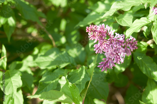Fresh pink and purple lilac branch macro, copyspace, selective focus, toned, banner