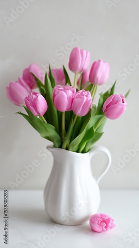 Fresh pink tulips in a white pitcher create a vibrant display for spring decoration at home or an event